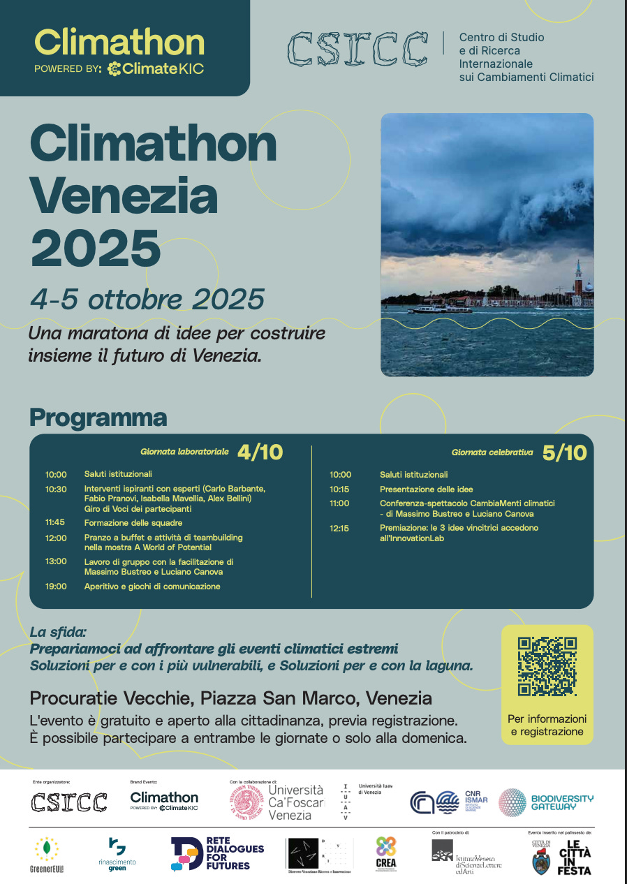 In collaborazione con: Università Ca’ Foscari Venezia, Università IUAV di Venezia Consiglio Nazionale delle Ricerche (CNR), Biodiversity Gateway del National Biodiversity Future Center, Distretto Veneziano della Ricerca e dell’Innovazione, GreenerEU, Rete Dialogues for Futures, Rinascimento Green, Centro Ricerche EtnoAntropologiche APS, con il patrocinio dell’Istituto Veneto di Scienze, Lettere, ed Arti.