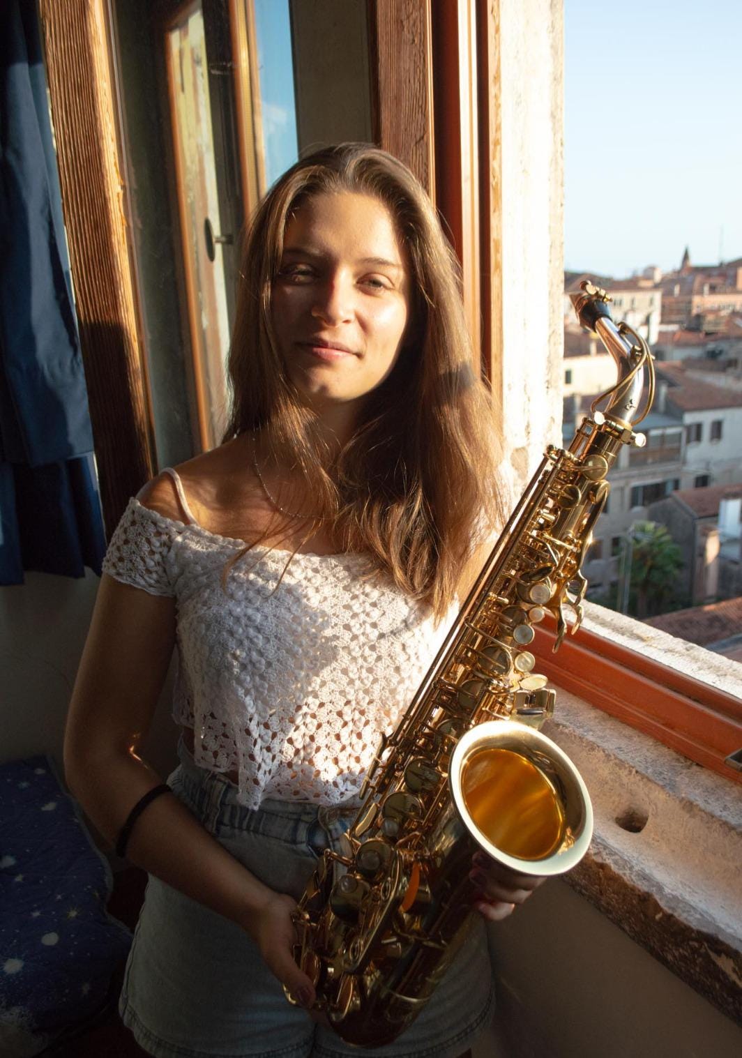 Attraverso pittura e musica, Carla, sassofonista, propone una performance interdisciplinare costruita sui suoni di Venezia e su dipinti ad acquerelli, offrendo una nuova prospettiva sulla sfida dell’innalzamento del livello del mare.
